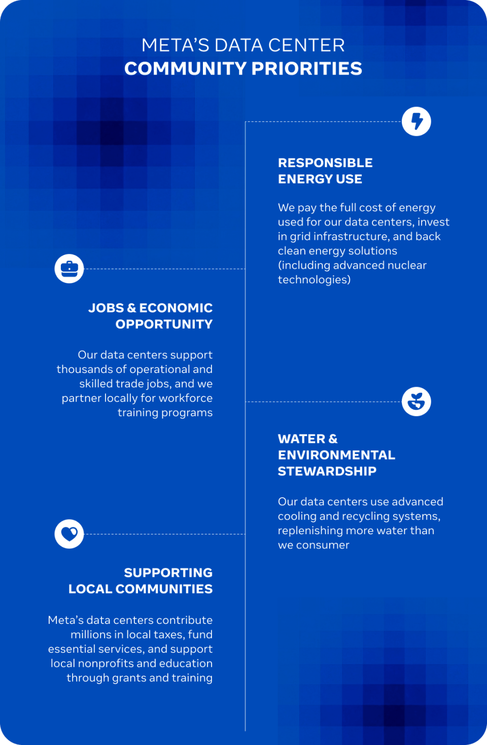For 15 years, Meta has built and operated some of the most efficient and innovative data centers in the world, and we work hard to be a good neighbor in communities where we have data centers. We do this by focusing on four key areas: responsible energy use, supporting jobs and workforce development, minimizing our impact on water and the environment, and supporting community priorities, schools, and nonprofits.